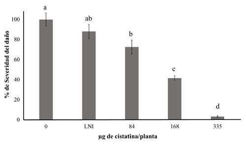 Figure 2 Severity of the damage produced by Alternaria alternata in tomato plants var. Río Grande treated with different concentrations of amaranth cystatin. Tomato plants infected with A. alternata were treated with different doses of the cystatin lysate (2 applications) and after 10 days from the last application the damage was evaluated. Plants sprayed with water (0) and E. coli cell lysate in which cystatin production was not induced (LNI) were used as controls. The bars above the columns indicate the standard error (n= 5). Different letters indicate significant differences between treatments. Tukey (p≤ 0.05).
