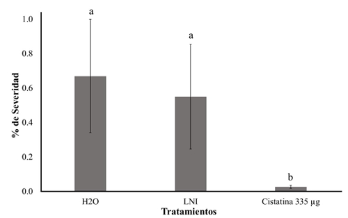 Figure 4 Preventive effect of cystine on the development of early blight in tomato plants var. Brandywine. Tomato plants previously treated with cystatin were infected with A. alternata and after 12 days the damage was evaluated. Plants sprayed with water (H2O) and E. coli cell lysate in which cystatin production was not induced (LNI) were used as controls. The bars above the columns indicate the standard error (n= 5). Different letters indicate significant differences between treatments according to the Tukey test (p≤ 0.05).