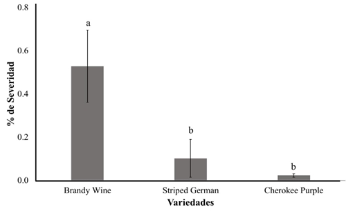 Figure 3 Severity of the damage produced by Alternaria alternata in tomato plants var. Brandywine, Cherokee Purple and Striped German. Damage was evaluated 12 days after infection in tomato plants sprayed with water and subsequently inoculated with A. alternata. The bars above the columns indicate the standard error (n= 9). Different letters indicate significant differences between treatments according to the Tukey test (p≤ 0.05).