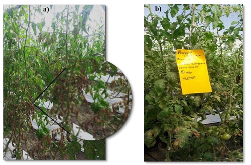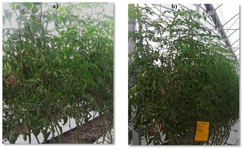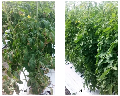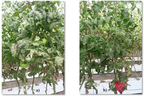 Figure 5 Tomato plant variety Brandywine treated with a) conventional chemical control; and b) with cystatin (168 µg plant-1).