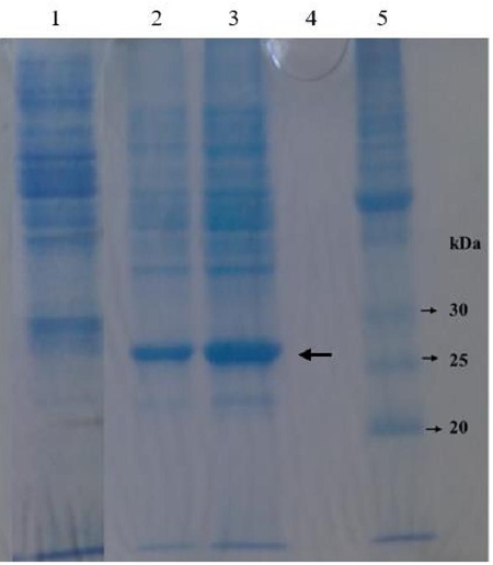 Figure 1 Electrophoretic profile of cell lysates of the E. coli strain, producer of cystatin. Cell lysates were prepared as described in materials and methods and analyzed on 12% SDS-polyacrylamide gels. Lane 1, cell lysate in which cystatin expression was not induced (4.5 µg protein). Cell lysate induced 3.5 µg protein (lane 2) and 8.7 µg protein (lane 3), lane 4 empty. BenchMark Protein Ladder marker (Thermo Fisher Scientific Inc., Waltham, Massachusetts) (lane 5). The arrow indicates the Cystatin band (28 kDa).