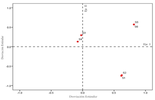 In relation to ACC, the characteristic roots for the first two management axes (Table 5) suggest that the composition of species among plant associations is related to environmental factors of the first two axes of variation; in other words, the analysis is satisfactory, since with the data corresponding to the first two axes of variation, the observed distribution can be explained and, possibly, the physicochemical characteristics are sufficient to explain (Granados et al., 2013).