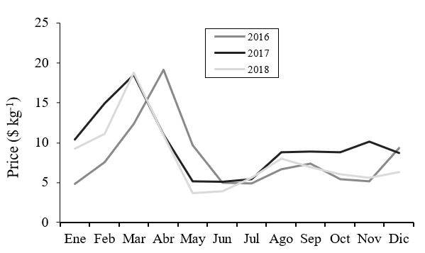 Figure 2 shows the price variation of the last three years in the market closest to Guerrero and where this information is available; The best prices are obtained at the beginning of the year, when there is little supply of lemon and the lowest prices from May to July with a slight rebound in November-December 2017 (SIIM, 2019).
