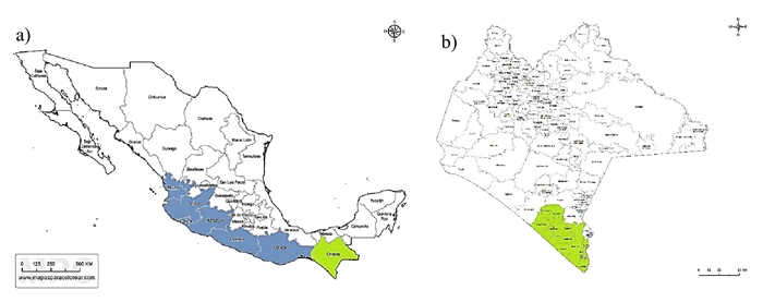 Figure 3 a) federal entities of Mexico producing Ataulfo mango (SIAP, 2017b); and b) municipalities that constitute the zone with the denomination of origin of Soconusco, Chiapas.