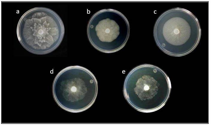 Figure 1 Morphotypes of P. capsici colonies from the state of Guanajuato observed in PDA. a) stellate; b) Filamentous; c) stoloniferous; d) torulous; and e) petaloid.