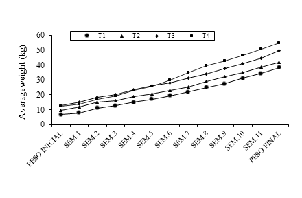 Statistical differences were found between treatments (p˂ 0.05) for the variable total weight gain (Table 1), where the highest value (42.67 kg) was obtained with treatment T4, a value that was different and higher (p˂ 0.05) to that registered with the T3 treatment, with an average of 35.81 kg. These results are different from those reported by Cunuhay (2013), who found that the highest total weight gain was obtained in pigs with 100% commercial balanced feed, reaching a final weight gain of 46.4 kg and less weight gain when 45% of HGCF was included in the diet with a weight gain of 36.3 kg.