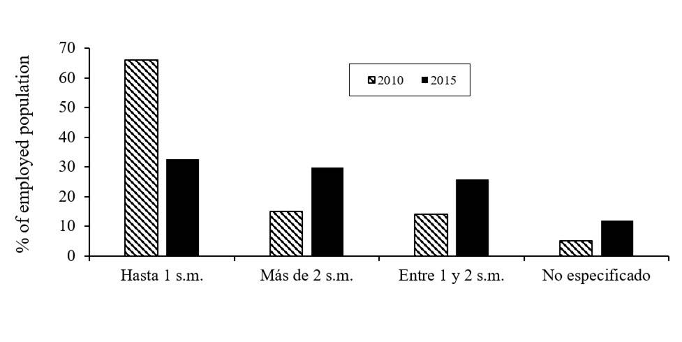 Income levels in the region have generally been low (Figure 1), the bulk of the employed population earns up to 1 minimum wage (sm, for salario mínimo in Spanish); however, there was an important change from 2010 to 2015, where the percentage of the population earning up to 1 sm decreased by half, increasing the number of people who earned more than 2 sm and between 1 and 2 sm (INEGI, 2015). This situation is related to the process of change in the main economic activities, where agricultural activity lost its leading role in the regional economy and where wage labor displaces agricultural activity, they are part of the great transformations that currently occur in the rural population (de Grammont, 2009).