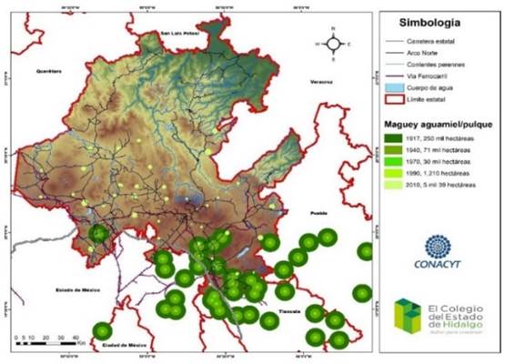 In this section, the visual representation of the territory is decisive, therefore, through the Geographic Information Systems (GIS), the historical and spatial trend of the plant is exemplified. In the GIS, the centroid represents the maguey-producing locality, official data from the database called main data by locality ITER were used, which include the coordinates that allow to define only the centroids of the polygons of the existing localities. Once these data were obtained, these coordinates were converted to the UTM system, datum WGS 84, since they are originally in geographical format in degrees, minutes and seconds.