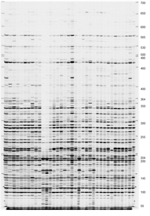 Figure 1 Amplified fragment length polymorphisms (AFLP), genetic profiles generated by the combination of E+AT/T+CA primers in 30 P. capsici isolates from the state of Guanajuato and 2 reference strains, showing the definition and intensity of the amplified DNA fragments (bands).