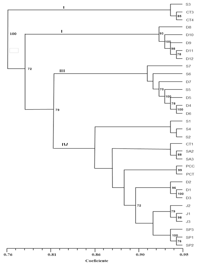 The similarity matrix based on the Dice coefficient shows values ranging from 76 to 95% similarity with an average of 86%, these genetic relationships are reflected in the consensus dendrogram obtained in this work (Figure 2). In it, one can see the formation of four well-defined groups, group I formed with two isolates from Cortázar and one from Silao, which have the least similarity with the rest; the groups with the largest number of isolates are group II, formed only by isolates from Dolores Hidalgo, and group III, formed by a mixture of isolates from Silao and Dolores Hidalgo, group IV is formed by six subgroups, highlighting that five of them are formed only with isolates from the same municipality, these are the subgroups formed only with isolates from Silao, Dolores Hidalgo, San Luis de la Paz, Juventino Rosas and the subgroup formed by the two reference strains, which, following the observed trend could, come from the same locality.