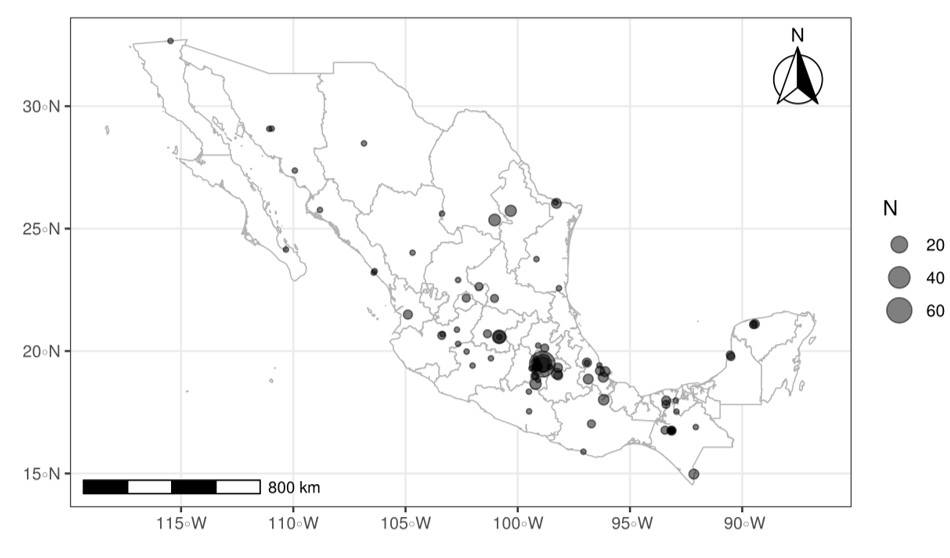 From 2010 to June 2021, of the 32 states of the Mexican Republic, 27 have institutions that participated in the publication of a paper referring to seeds (Figure 4). By state, the personnel attached to institutions located within the State of Mexico stand out with 101 papers, followed by Veracruz with 16 papers. In the period of review, in the northern states and part of western Mexico, published research on seeds is limited, probably because in these states are the large seed companies, which fulfill the function of researching and solving the problems in terms of seeds of species of commercial interest.