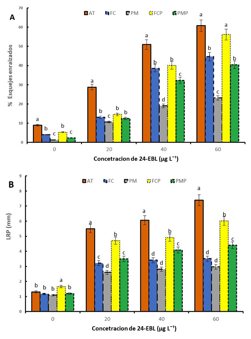 Cuando se analizó el efecto del 24-EBL, sobre el porcentaje de supervivencia de esquejes, se observó un efecto significativo de este factor dependiendo de la concentración, cuando los esquejes se trataron a 60 µg L-1 esta variable fue de 54.75% mientras que con 0 µg L-1 solo 5.11%. Los tratamientos de AT con 20 y 40 µg L-1 presentaron un 36% y 63.7% respectivamente.