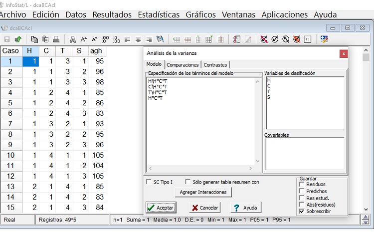 En InfoStat y InfoGen se elabora una tabla rotulando verticalmente con H, C, T, S, agh, para identificar hileras, columnas, tratamientos, submuestra y variable respuesta, respectivamente. Para cada combinación de hilera, columna y tratamiento se capturan cíclicamente los valores de las muestras 1, 2, 3. Después de verificar la base de datos y realizar su resguardo, en menú principal elegir: ‘estadísticas/análisis de la varianza’. Con flecha adelante, ‘agh’ será enviado a variables dependientes y ‘H, C, T y S’ serán trasladadas a variables de clasificación. elegir ‘aceptar’. ‘H, C, T y H*C*T’ serán capturadas verticalmente en ‘especificación de los términos del modelo’, en las tres primeras, después de la diagonal inversa (\) debe escribirse H*C*T, que es el error experimental. En variables de clasificación debe mostrarse ‘H, C, T y S’.