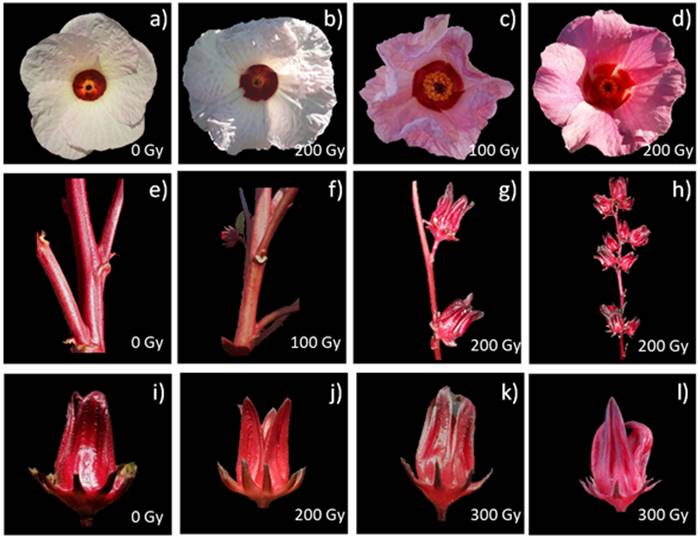 Regarding the calyces, four plants that presented pink calyces (Figure 3l) and three with salmon-colored calyces with small capsules and abnormal seeds were identified, both in 100, 200 and 300 Gy (3j), the parental presented red calyces (Figure 3i). Likewise, two plants with calyces with little or very weak pubescence were identified in 200 and 300 Gy (Figure 3k).