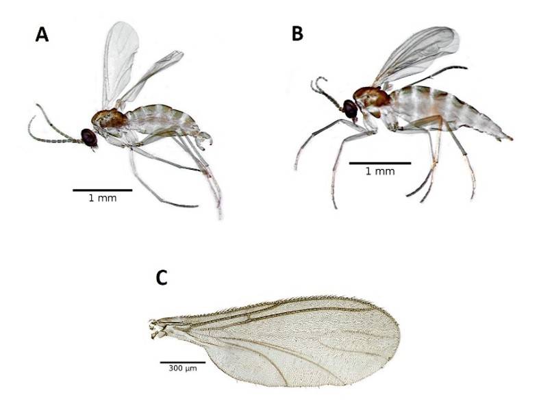 Globally it is estimated that the number of ‘black fungus gnat’ species ranges between 5 000 and 10 000, of which about 2 400 species have been described (Mohrig and Menzel, 2009; Ramírez and Alonso, 2014); in the Nearctic region (Canada, United States of America, and North of Mexico), 166 species of 25 genera are estimated (Mohrig et al., 2012). The genus Bradysia Winnertz is the most numerous of the family Sciaridae, with 433 species (Menzel and Mohrig, 1999). This pest is considered mycophagous, although it has also been described as an opportunistic herbivore (Katumanyane et al., 2018) and, despite its economic and ecological importance, it has been little studied due to its small size, way of life, and difficulty in determining its taxonomic identity (Mohrig and Menzel, 2009; Villanueva-Sánchez et al., 2013).