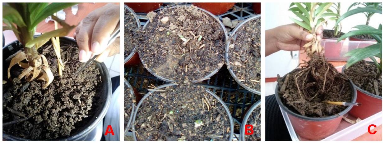 Figure 5 Symptoms caused by larvae of Bradysia sp. in plants of Lilium sp. A) yellowing of basal leaves; B) premature death of the plant; and C) presence of few roots.