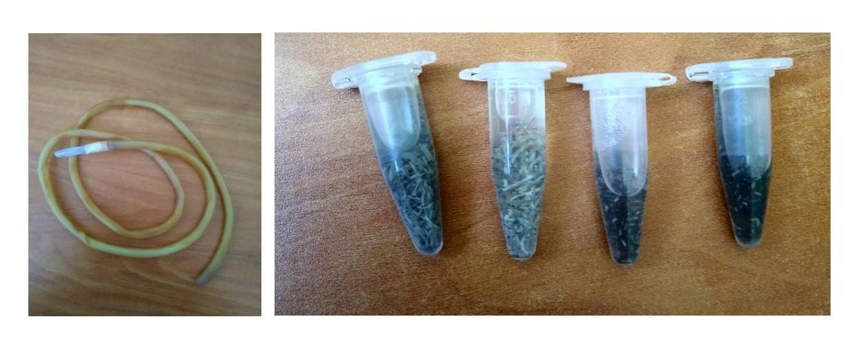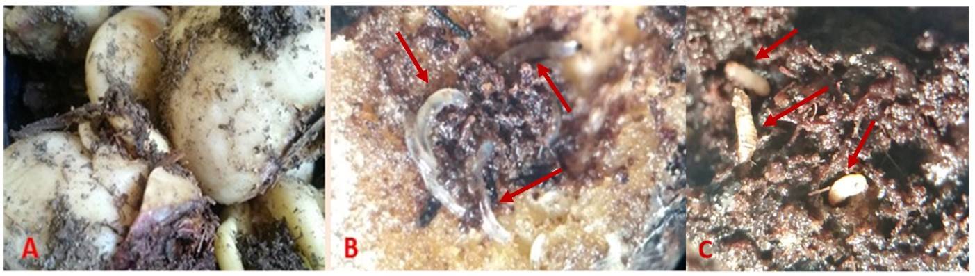 Figure 6 A) lily bulbs infested by ‘black fungus gnat’ larvae; B) larvae found in bulbs; and C) pupae.
