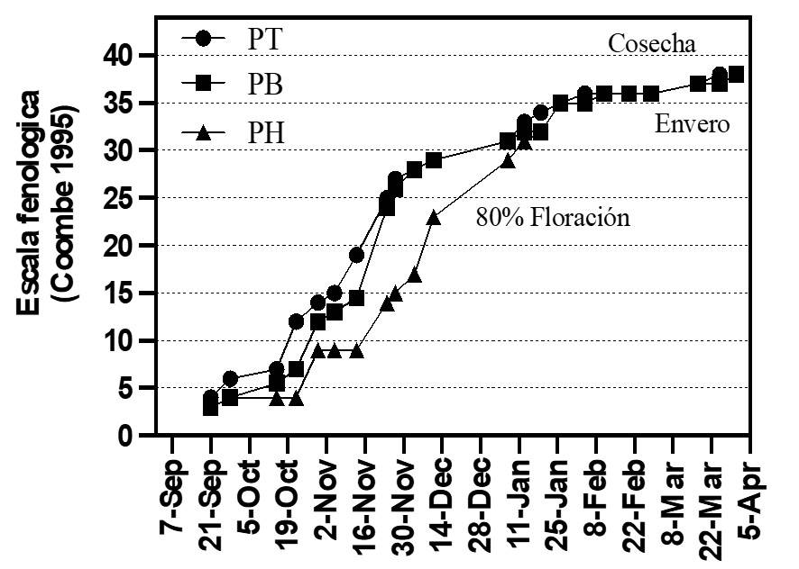 Figure 1 Phenology of the treatments of traditional pruning (PT ●); pruning at bud break (PB ■) and pruning in 2-3 leaves (PH ▲) in cv Cabernet Sauvignon, according to the phenological pattern of Eichhorn and Lorenz modified byCoombe (1995).