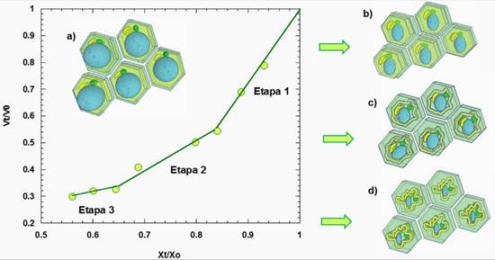 Figure 2 Changes in volume (Vt/Vo) and moisture content (Xt/Xo) of slices of virens levis chayote fruit during osmotic dehydration in sucrose solution (50% at 35 °C). Fresh plant cells at the beginning of the process (a). Modifications at the cellular level during stages 1 (b); 2 (c); and 3 (d) of the osmotic process (Huerta-Vera, 2021).