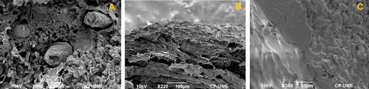 Figure 4 A) SEM micrographs of the structure of slices of Tabasco banana (Musa paradisiaca) without osmotic treatment; B) Slices with osmotic treatment at atmospheric pressure with sucrose solution (50%, 35 min at 35 °C); and C) Slices with osmotic treatment with 10 min vacuum pulse with sucrose solution (50%, 35 min at 35 °C) (Huerta-Vera, 2021).