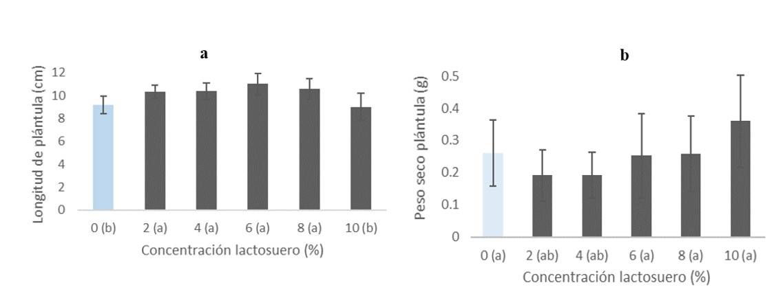 Figure 4 Sublethal effect of sweet whey on length (a) and biomass; and (b) of 60-day-old alfalfa seedlings. Different letters between columns indicate a significant difference (t-Student p< 0.05).