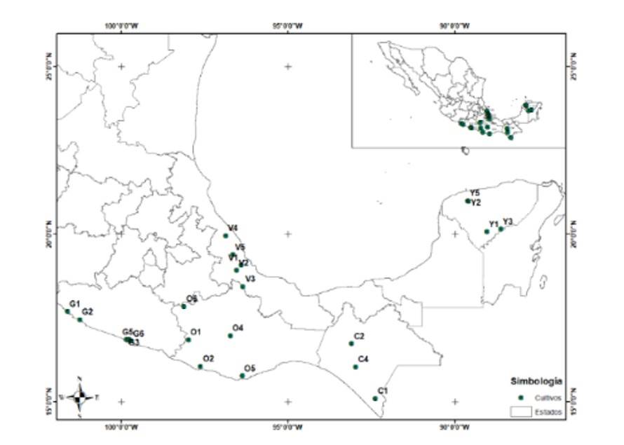 Los estados de Oaxaca y Guerrero, estuvieron representados por un 22.22% de los participantes de la encuesta y los estados de Veracruz, Chiapas y Yucatán en un 18.52% cada uno. Se determinó la altitud (msnm), temperatura media (°C) y precipitación anual (mm) en cada cultivo comercial. Los factores ambientales para los cultivos fueron V1 (67 msnm, 26 °C y 1 039 mm), V2 (210 msnm, 25 °C y 1 134 mm), V3 (50 msnm, 26 °C y 1 658 mm), V4 (202 msnm, 23 °C y 1 886 mm), V5 (349 msnm, 25 °C y 894 mm), O1 (341 msnm, 26 °C y 1 603 mm), O2 (17 msnm, 28 °C y 1 302 mm), O4 (1 507 msnm, 21 °C y 634 mm), O5 (175 msnm, 26 °C y 1 016 mm), O6 (1 081 msnm, 24 °C y 623 mm), G1 (21 msnm, 27 °C y 1 015 mm), G2 (10 msnm, 27 °C y 905 mm), G3 (124 msnm, 27 °C y 1 146 mm), G5 (17 msnm, 27 °C y 1 122 mm), G6 (19 msnm, 27 °C y 1 114 mm), C1 (134 msnm, 27 °C y 3 456 mm), C2 (525 msnm, 25 °C y 930 mm), C4 (570 msnm, 25 °C y 1 830 mm), Y1 (40 msnm, 26 °C y 1 168 mm), Y2 (8 msnm, 27 °C y 1002 mm) y Y3 (29 msnm, 26 °C y 1 219 mm).