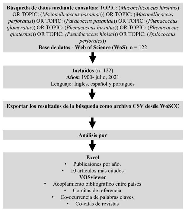Para seleccionar la muestra de artículos analizados en este estudio, se ejecutó una búsqueda de artículos con un período de tiempo de 1900 a julio 2021. En primer lugar, se estableció el tema de recuperación como: topic: (Maconellicoccus hirsutus) or topic: (Maconellicoccus pasaniae) or topic: (Maconellicoccus perforatus) or topic: (Paracoccus pasaniae) or topic: (Phenacoccus glomeratus) or topic: (Phenacoccus hirsutus) or topic: (Phenacoccus quaternus) or topic: (Pseudococcus hibisci) or topic: (Spilococcus perforates).