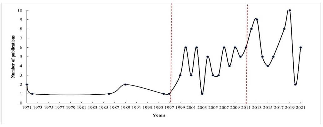 El primer periodo, presentó una producción invariable (1971-1998) con una media de 1.33 ±0.51 artículos por año. El segundo periodo (1999-2011) muestra una media de 4.38 ±1.66 artículos por año, en este periodo se observó un marcado incremento en el año 2000 y a pesar de los picos en el número de publicaciones, con un máximo de 6 (en los años 2002, 2007 y 2009) y un mínimo de 2 (2003), resultó en una tendencia creciente en la producción científica dentro del periodo.