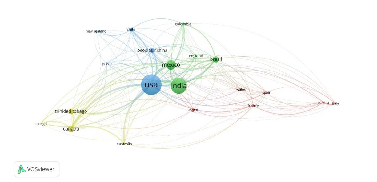 De esta forma, se observó que, Estados Unidos de América (EE. UU) tiene una influencia central en M. hirsutus y otros países como la India, México, Canadá, Brasil, China, entre otros están acoplados a EE. UU. Así, el primer clúster (rojo) está formado: Gales, Túnez, España, Italia, Francia y Egipto, el segundo clúster (verde), está formado por USA, China, Nueva Zelandia, Japón y Chile. El tercer clúster (azul) está formado por India, México, Brasil, Inglaterra y Colombia, cuarto clúster (verde olivo) está formado por: Canadá, Trinidad y Tobago, Senegal y Australia.