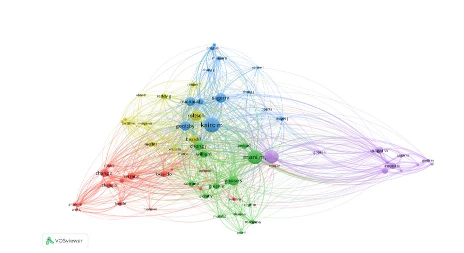 La cocitación es una relación de coocurrencia que se da cuando dos ítems de la literatura existente son citados juntos por un tercero. Se encontró un total de 3 112 referencias cocitadas sobre M. hirsutus. En la Figura 4, se observaron 69 cocitas de referencias (con número mínimo de citas para una referencia = 5).