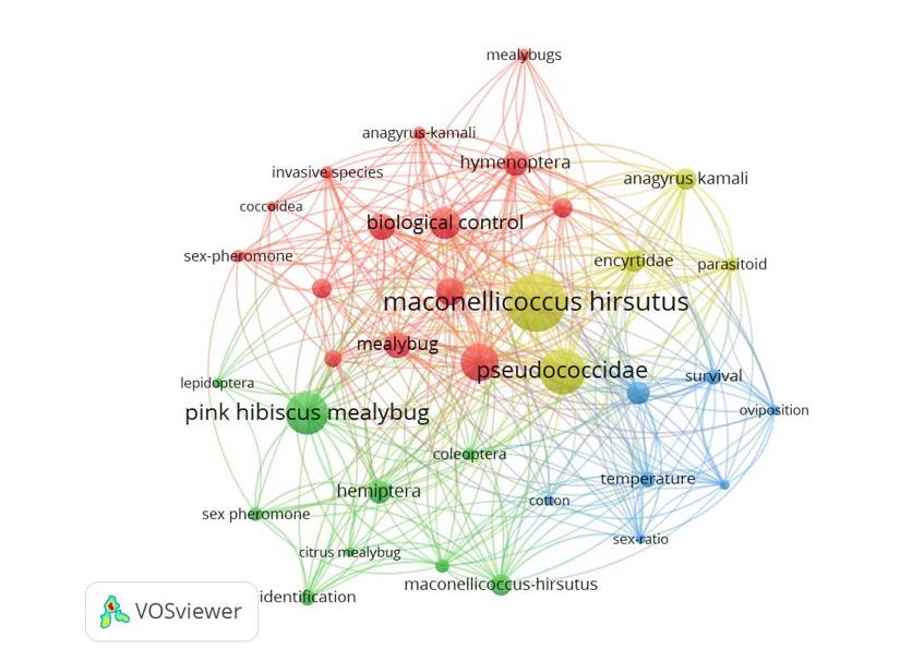 El primer clúster (rojo), está formado por 14 palabras sobre control biológico de M. hirsutus; por ejemplo, enemigos naturales, feromonas y A. kamali. El segundo clúster (verde), lo forman nueve palabras relacionadas con la taxonomía de M. hirsutus, nombre común y plaga. El tercer clúster (azul), se integró por siete términos sobre el aspecto reproductivo, como: fecundidad, proporción de sexo, ovoposición, temperatura y supervivencia. Y el cuarto (olivo), incluyó cinco términos, sobre la utilización del parasitoide A. kamali. Recientemente se han publicado más estudios centrados en la búsqueda de enemigos naturales, control biológico y continúan los trabajos con A. kamali.