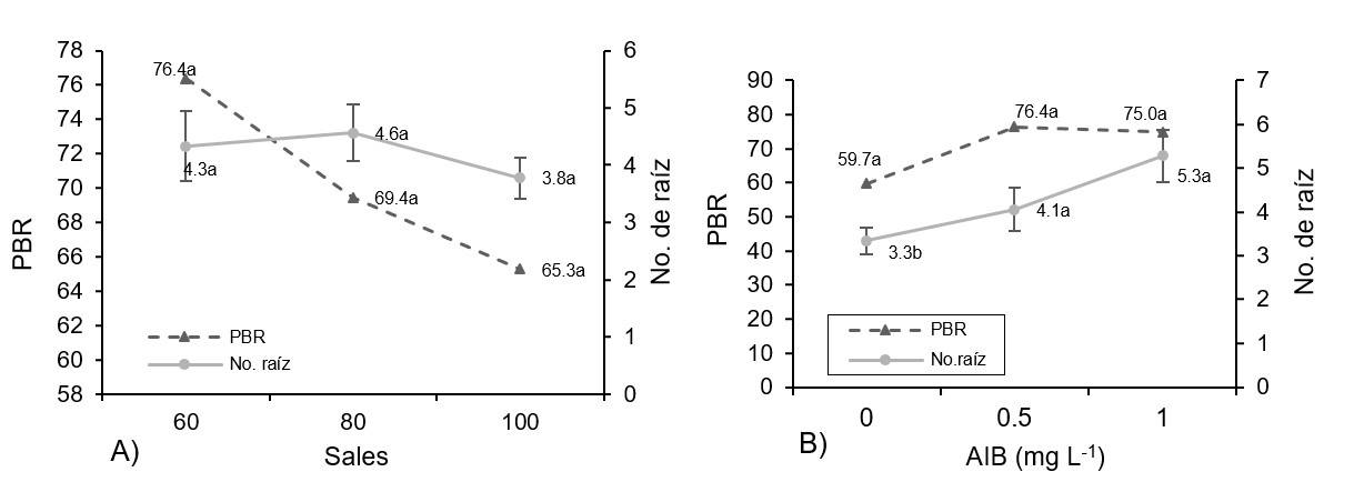 Figura 1 En los primeros 29 días de la etapa de enraizado, el porcentaje de brotes (línea discontinua) de A. nussaviorum que formaron raíces (PBR) y número de raíces formadas (línea continua) en función de los factores principales, sales minerales (A) y AIB (B).