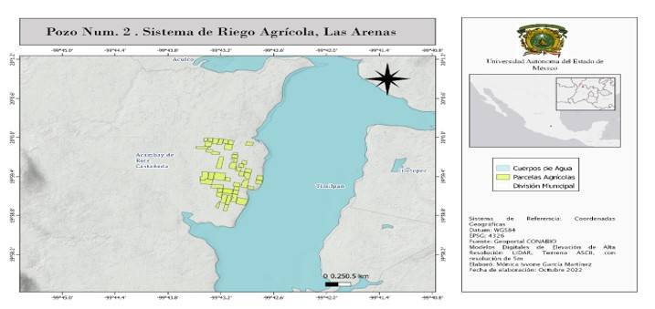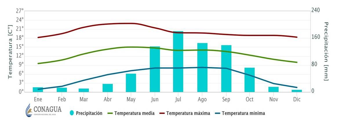 Zona de estudio. Se monitorearon 40 parcelas de cultivo de maíz criollo en el pozo número 2 del sistema de riego agrícola de la localidad Las Arenas municipio de Acambay, Estado de México. En conjunto, estos abarcan una superficie total de 63 ha (Figura 1). La zona se caracteriza por tener un clima templado con lluvias en los meses de junio-septiembre, con una precipitación máxima de 160 mm y una temperatura promedio de 15 °C. La temporada de estiaje comprende los meses de diciembre, enero y febrero; mientras que la temporada de lluvia abarca a los meses comprendidos de junio a octubre (Figura 2).