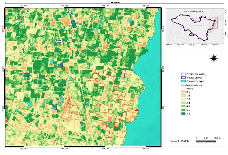 Diversas técnicas de percepción remota han sido aplicadas para estimar anticipadamente el rendimiento de las parcelas de maíz (Soria et al., 2004). El presente estudio empleó datos obtenidos en campo para obtener un modelo más robusto de predicción del rendimiento en el municipio de Acambay, Estado de México. Ello porque, aunque las imágenes de satélite y los índices derivados de ellas proporcionan información valiosa, las mediciones de biomasa, densidad y parámetros fisiológicos de las plantas medidos sobre el terreno son esenciales para validar los modelos, mejorando su precisión.