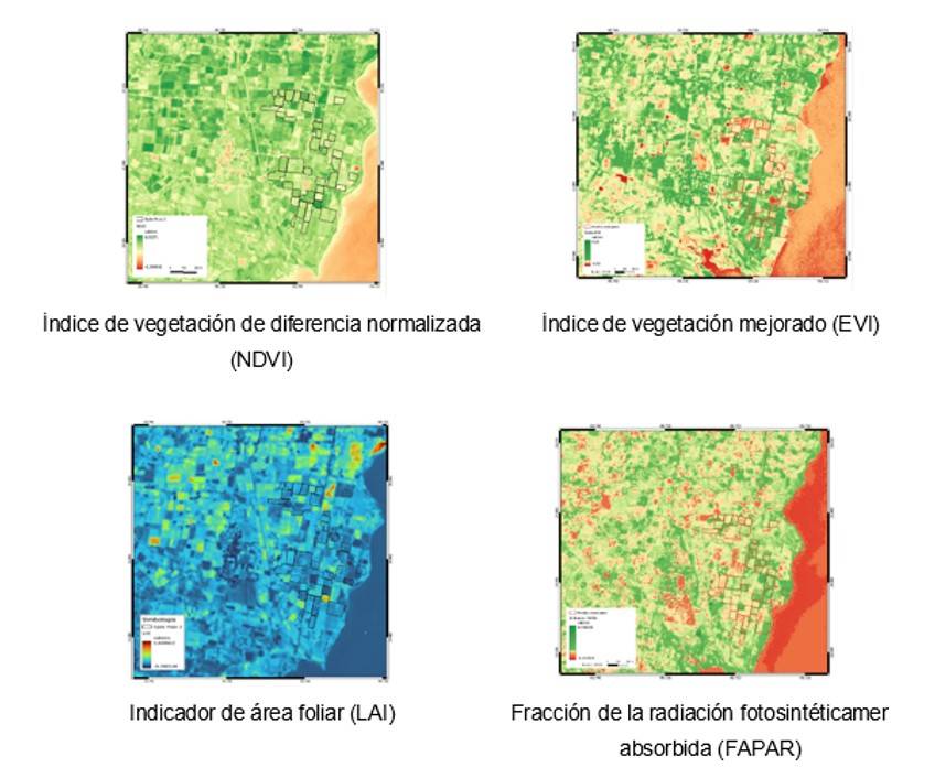 Los Indicadores biofísicos son variables que se pueden usar para evaluar el estrés de la vegetación y pronosticar los rendimientos agrícolas. El índice de área foliar (LAI) por sus siglas en inglés, calcula el área de hojas por unidad de superficie del suelo, mientras que la fracción absorbida de la radiación fotosintéticamente activa (FaPAR), cuantifica la radiación solar absorbida por las plantas dentro de la región espectral fotosintéticamente activa (Ovando, 2021). El LAI está estrechamente relacionado con la productividad y biomasa de las plantas, un mayor valor indica un mejor desarrollo de dosel y por tanto, un mayor rendimiento potencial (Hu et al., 2014). Por su parte, FaPAR es indicador de la actividad fotosintética y la productividad de la vegetación. Al relacionarse directamente con la energía absorbida por las plantas para su crecimiento, puede complementar a otros índices (Qin et al., 2018).
