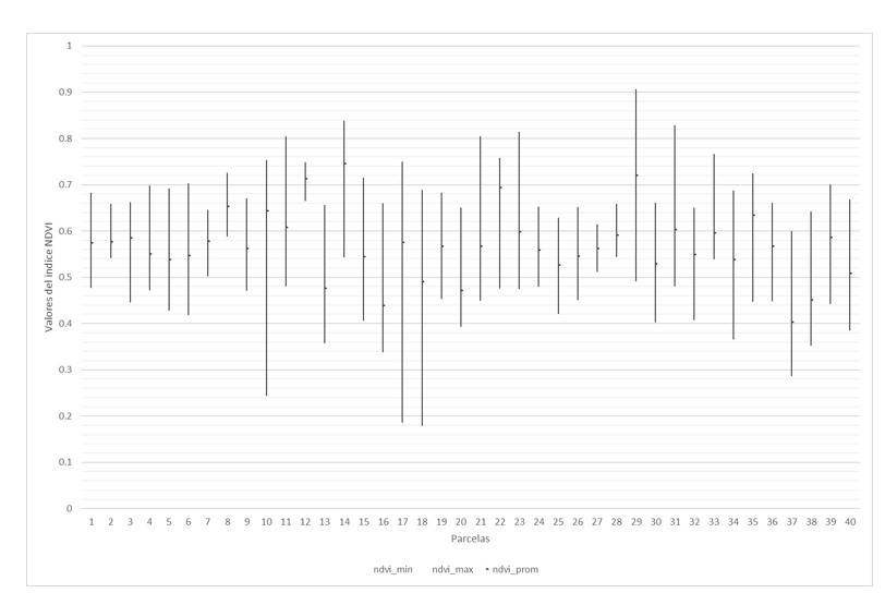 En este estudio la parcela es la unidad territorial de análisis; es decir, que los valores de píxel de los índices obtenidos de las imágenes satelitales se promediaron por parcela y los valores de rendimiento muestreados en campo también se suman por parcela. Ello, debido a que la resolución espacial de la imagen impide una relación directa entre el píxel de la imagen y el individuo (planta) en campo.