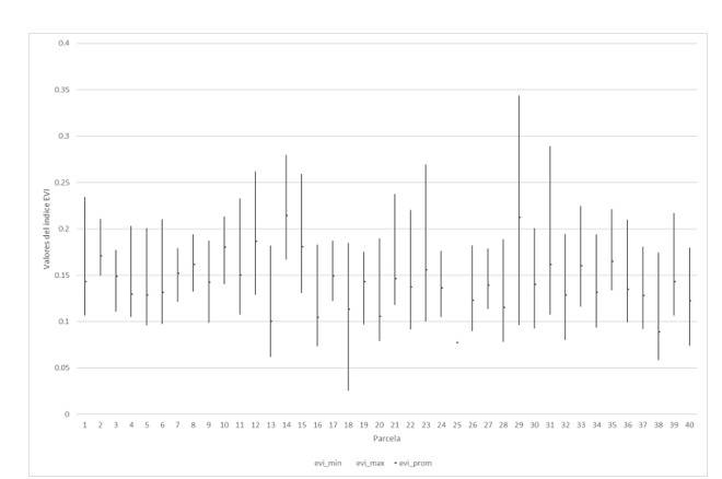 El índice de vegetación mejorado EVI mostró sus rangos promedio entre 0.1 y 0.25, obteniendo un valor mínimo de 0.025 y un máximo de 0.34 (Figura 5).