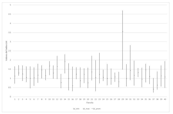 Figura 6 Valores del índice LAI en octubre 2022 en las parcelas de Las Arenas, Acambay, calculados en el tratamiento de la imagen Sentinel-2.