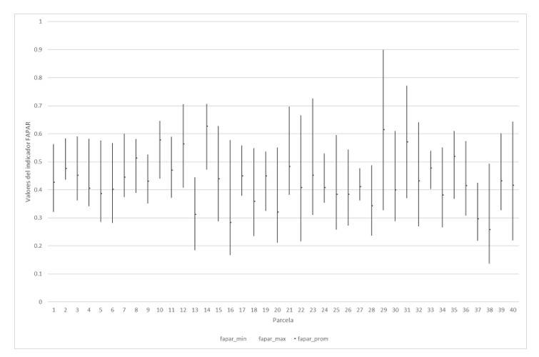 El indicador FaPAR mostró valores mínimos de 0.16 y máximo de 0.89 (Figura 7). Destaca este indicador por ser el que presenta mayor variabilidad entre parcelas.