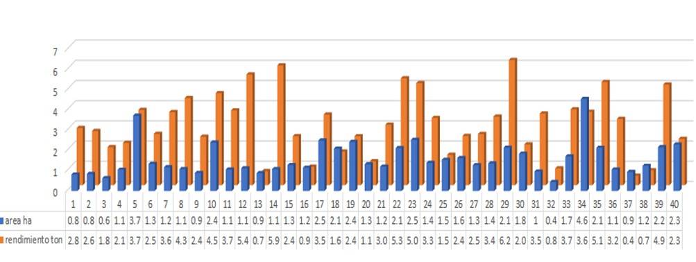 Como se puede observar en la Figura 8, el rendimiento en las 40 parcelas evaluadas fue muy variable, teniendo rendimientos desde menos de 1 t ha-1 hasta 6.2 t ha-1. El tamaño de la parcela no necesariamente determina la producción, pues hay algunas pequeñas con alta producción y otras grandes con bajas producciones, lo que permitió resaltar la importancia del manejo del cultivo, como un factor decisivo en la producción.