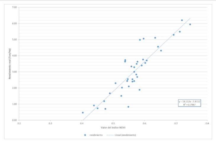 El modelo tiende a sobrestimar el rendimiento cuando hay valores altos de NDVI (0.7); calculado con valores promedio del NDVI (0.5-0.6) su desempeño es mejor. En promedio la diferencia entre rendimientos es de hasta 1.5 t; es decir, el modelo varía hasta en 26% con respecto a la producción real. Dada la fuerte correlación entre el valor promedio de NDVI y la cosecha estimada, se podría estimar el rendimiento, al menos dos meses antes de la cosecha, coincidiendo con Prasad et al. (2006). Se requieren repeticiones en otras zonas agrícolas y otras condiciones climáticas para confirmar esta capacidad predictiva del índice NDVI en Sentinel 2. Ello, porque el rendimiento de los cultivos obedece a diversos factores, como las propiedades del suelo, las condiciones meteorológicas, las presiones por plagas y enfermedades, las prácticas de gestión y los rasgos genéticos del cultivo.