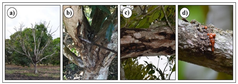 Figura 1 Árboles de mango variedad Manila con síntomas de la muerte descendente causada por Lasiodiplodia pseudotheobromae en Veracruz: a) decaimiento del árbol en fase terminal de muerte; b) chancros y grietas en tronco; c) chancros y grietas de ramas y d) secreción de sustancias de color ámbar rojizo comúnmente conocido como gomosis.