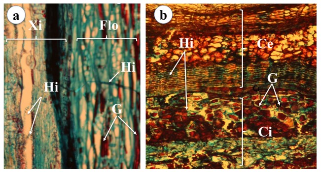 Figura 2 Estructura de tejidos de corteza de tallo de plántulas de Mangifera indica infectadas con Lasiodiplodia pseudotheobromae: a) corte longitudinal de la corteza con (20X), invasión de las hifas en Xilema (Xi) y Floema (Flo) y b) corte tangencial de la corteza (10X), mostrando las capas de células de corteza externa (Ce) y corteza interna (Ci), así como acumulación de goma (G) y presencia de hifas de Lasiodiplodia pseudotheobromae (Hi).
