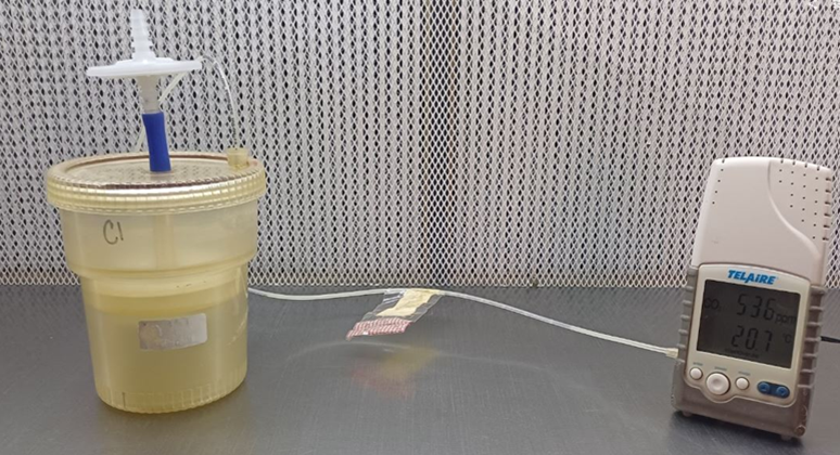Otra parte del estudió de trató en cuantificar la concentración de CO2 al tiempo cero, el cual es el inicio del período de multiplicación y posteriormente se realizaron evaluaciones cada 15 días hasta el final del período. Se utilizó un monitor de CO2 Telaire 2001 (Figura 1) que mide la temperatura y el CO2 de forma simultánea en un lapso máximo de 30 s. Ambos tipos de biorreactores estuvieron en las mismas condiciones de incubación descritas anteriormente. Se aseguró que el aire acondicionado estuviera apagado y que no hubiera personas en el cuarto de incubación durante las lecturas.