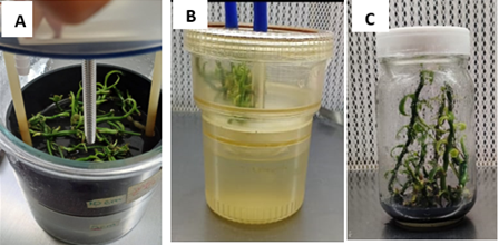 Testigo en medio semisólido SS (T3): consta de un frasco de vidrio que contiene los explantes que están en contacto constante con el medio de cultivo semisólido. Las especificaciones de cada tratamiento se observan en el Cuadro 1.
