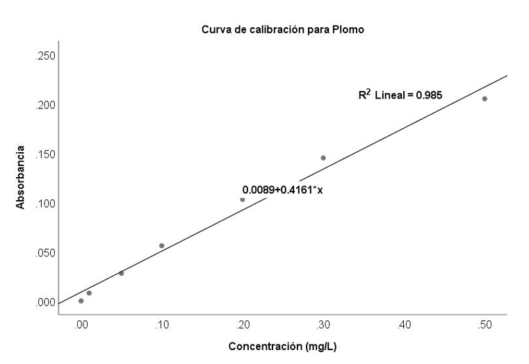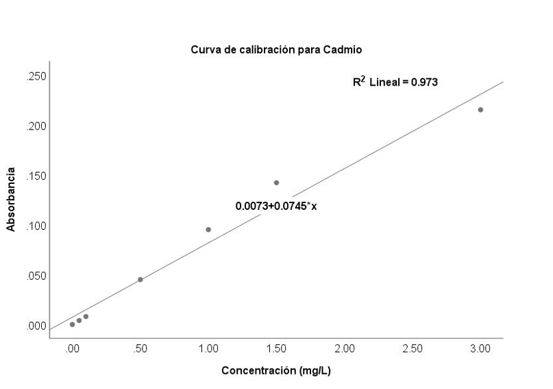 Por cada 100 ml de volumen de disolución final, se adicionaron 10 ml de ácido clorhídrico (1:1) y 15 ml de agua. Posteriormente, la muestra se calentó durante 15 min sin alcanzar el punto de ebullición y se aforó a 100 ml. Para la toma de lecturas, se calibró el espectrofotómetro de acuerdo con el inciso 9.3 de la norma NMX-AA-051-SCFI-2001, finalmente, se realizaron los cálculos, de acuerdo con la ecuación 1 de la recta, así como el coeficiente de determinación R2, con valores de 0.985 para Pb y 0.973 para Cd.