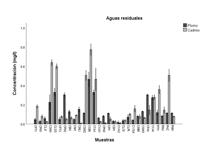Concentraciones de Pb y Cd en aguas residuales. El análisis de las muestras de aguas residuales reveló que el 26% de ellas superaron los límites permisibles de Pb, establecidos en 0.2 mg L-1, con concentraciones que oscilaron entre 0.017 mg L-1 y 0.466 mg L-1 (Figura 2).