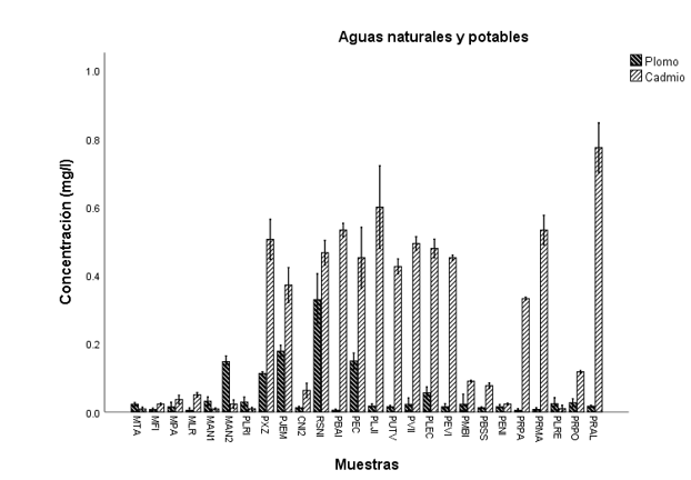 En este sentido, Lara et al. (2015) reportaron la presencia de Cd y Pb en cultivos de maíz, alfalfa y girasol, con concentraciones que variaron de 0.001 a 0.096 mg kg-1 para Cd y de 0.05 a 0.613 mg kg-1 para Pb. Las concentraciones de Pb y Cd registradas en muestras de aguas naturales y potables superaron los límites permisibles en un 70% y 100% de los casos, respectivamente. Además, se observaron diferencias estadísticas entre los valores obtenidos (Cuadro 2, Figura 3 y Figura 4).