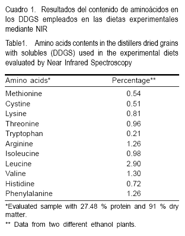 Los resultados del contenido de proteína y aminoácidos realizados a los DDGS utilizados en el experimento fueron similares a los comparados recientemente por otros autores, con pocas variaciones en el contenido de algunos aminoácidos(11-13). Los valores para la mayoría de los aminoácidos son similares a los señalados por Martínez et al(11) y Batal et al(14), quienes analizaron varias muestras de diferentes plantas localizadas en Estados Unidos. Sin embargo, para los aminoácidos treonina y arginina estuvieron por debajo a lo señalado por dichos autores. En el caso de treonina se obtuvieron valores más bajos (5 %) y para arginina 13 % menos a lo señalado por Martínez et al(11) y 11% menos de lo que indican Batal et al(14).