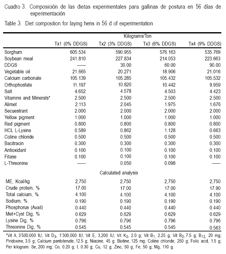 En el Exp 2, se utilizaron 288 gallinas Bovans White de 35 semanas de edad, alojadas en jaulas durante 56 días de experimentación. Se empleó un diseño completamente al azar de cuatro tratamientos con seis repeticiones de 12 gallinas cada uno. Los tratamientos fueron: 1) dieta basal sorgo-soya, 2) como 1+3% DDGS, 3) como 1+6 % de DDGS, 4) como 1+9% de DDGS.